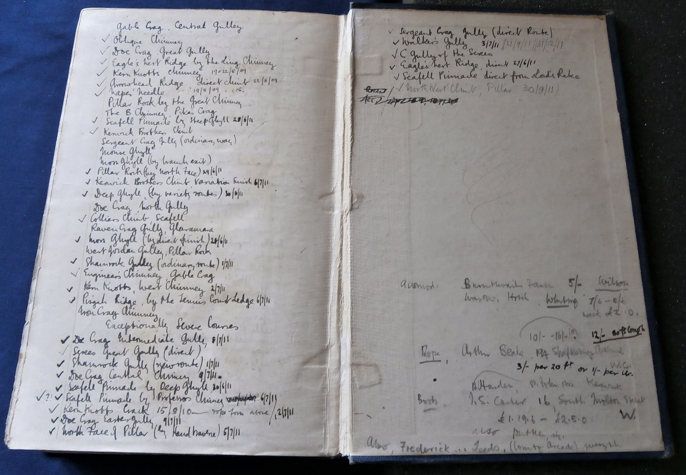 All the available spare pages, at both the beginning and end of the book, are crammed with ink-written lists of routes he had climbed from July 1909 to September 1911. He had divided the North Wales and Lake District climbs into ‘Scrambles’ and ‘Moderate, Difficult and Exceptionally Severe Courses’, with the initials of his climbing partners and the occasional added remark – ‘socks wet, severe struggles’.